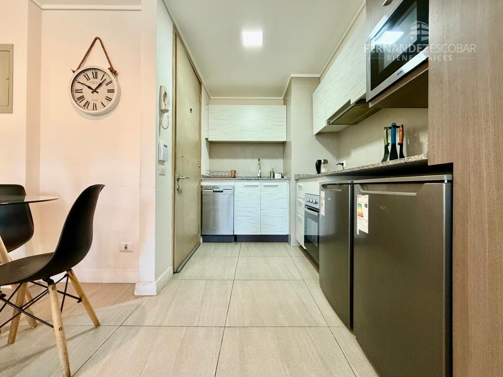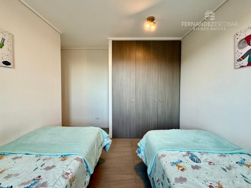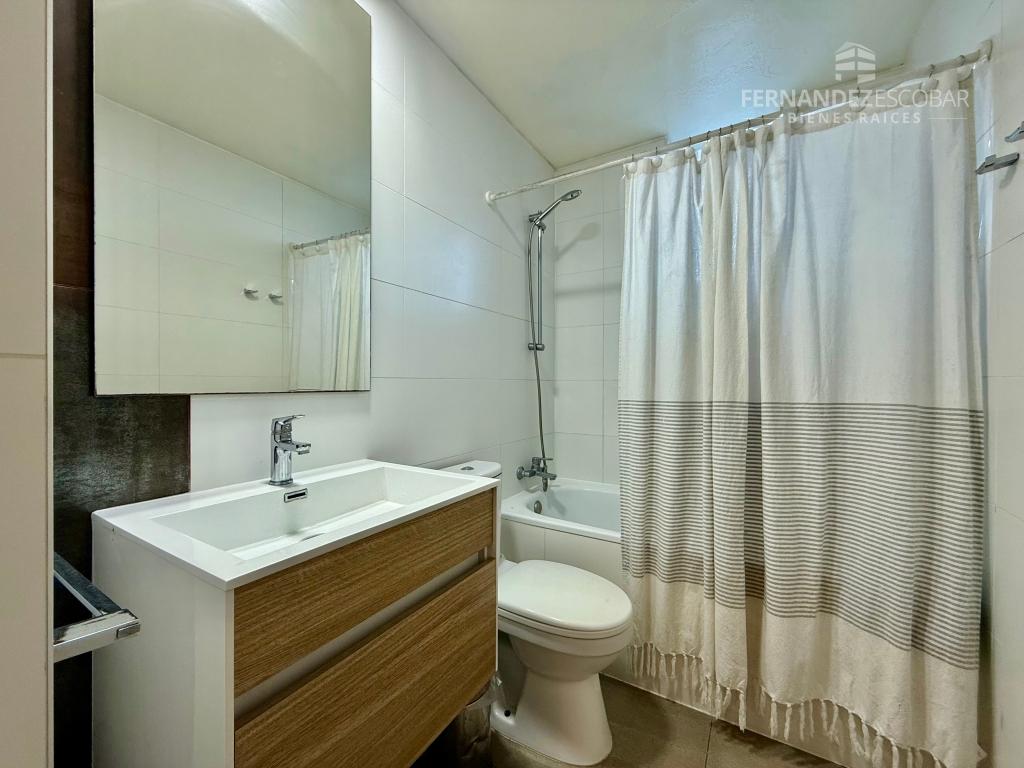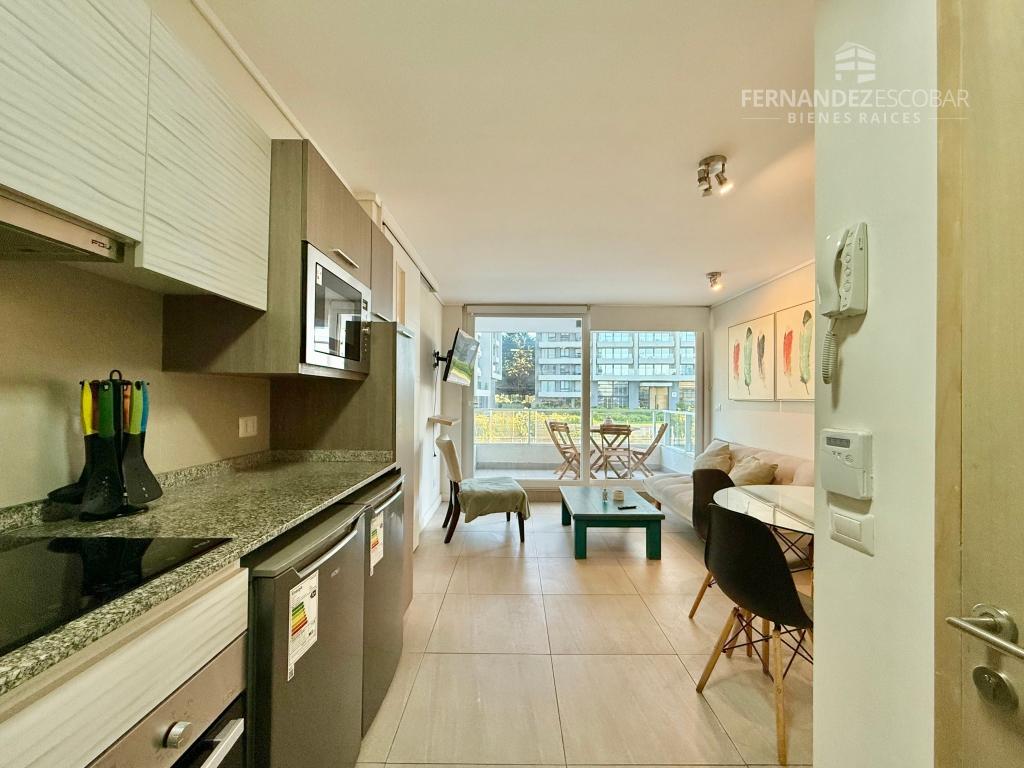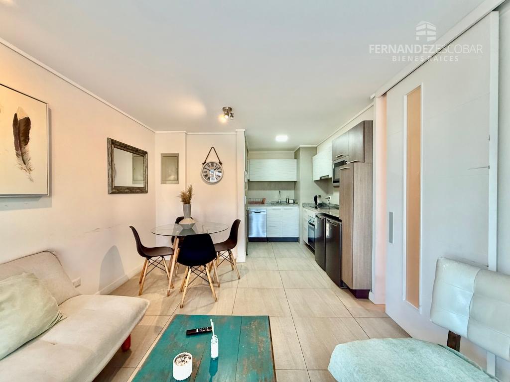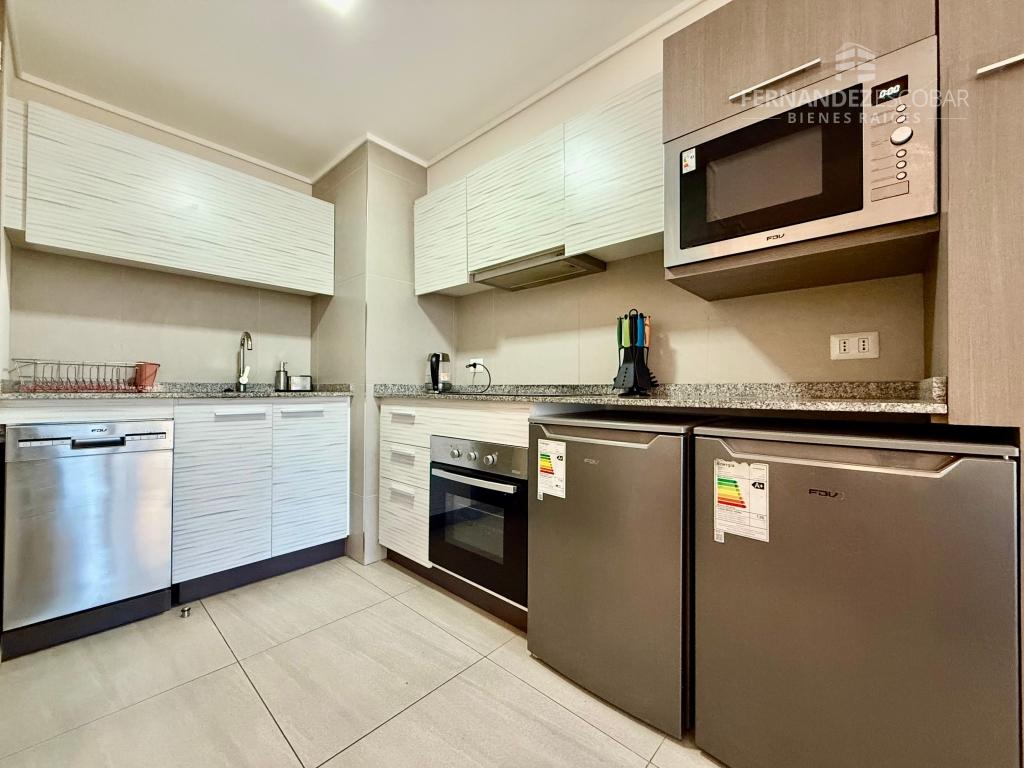 El departamento cuenta de living comedor con salida a la terraza. Dos dormitorios con closet. Baño completo con tina. Cocina amoblada y equipada con horno, encimera y campana. Bodega y estacionamiento.