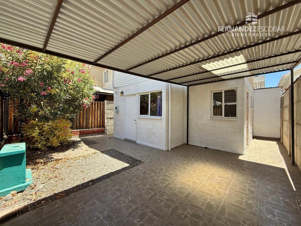 EXTERIORES: Patio trasero con logia y bodega. Frontis con estacionamiento techado.