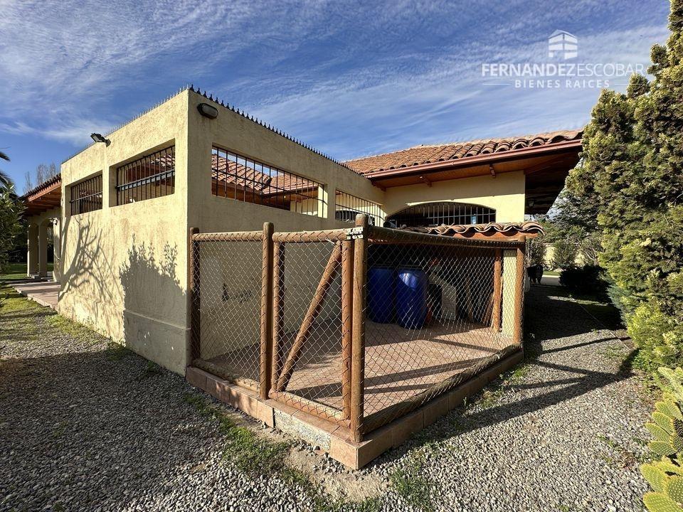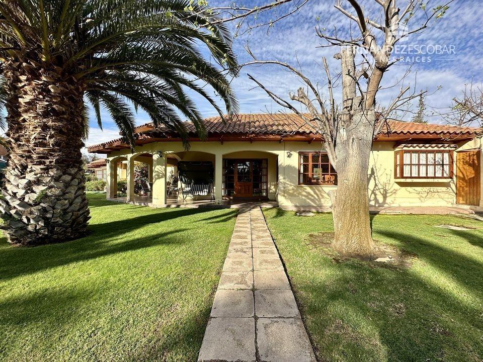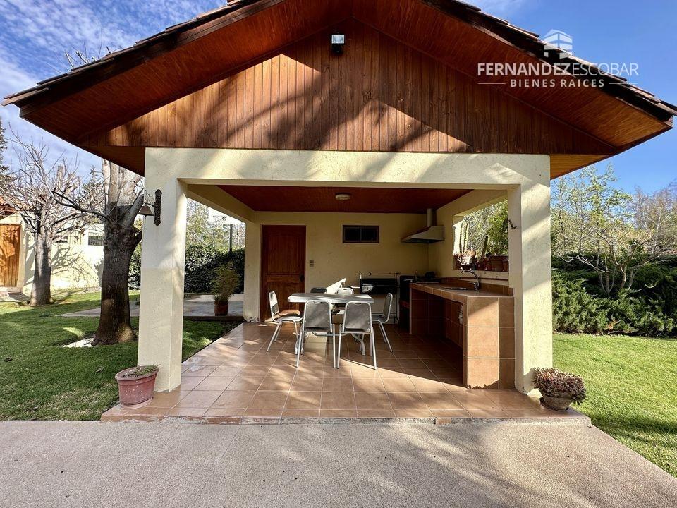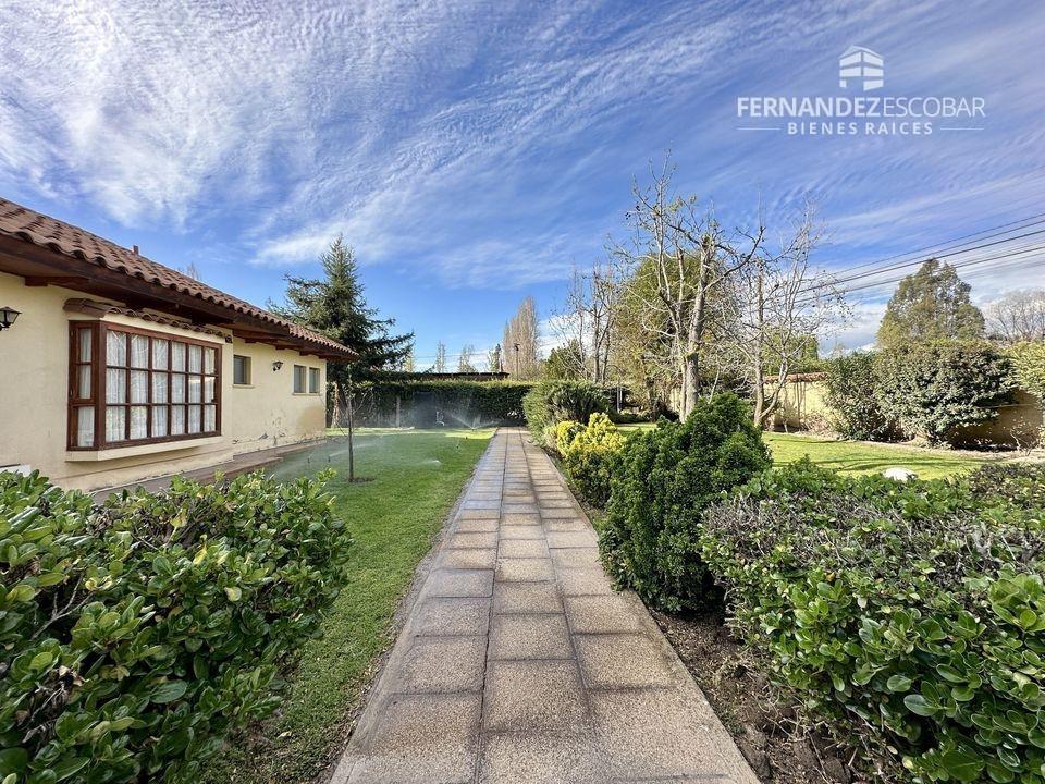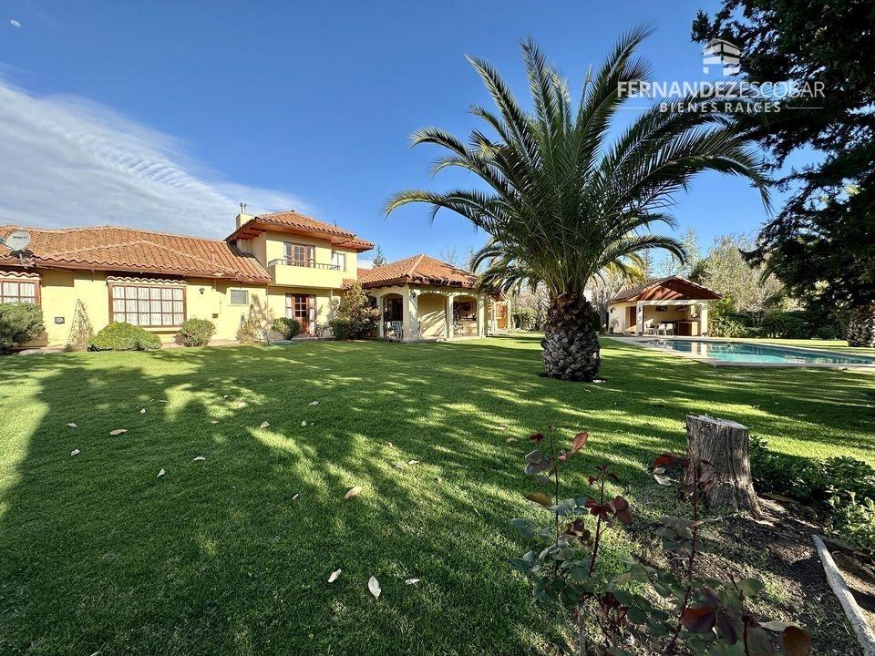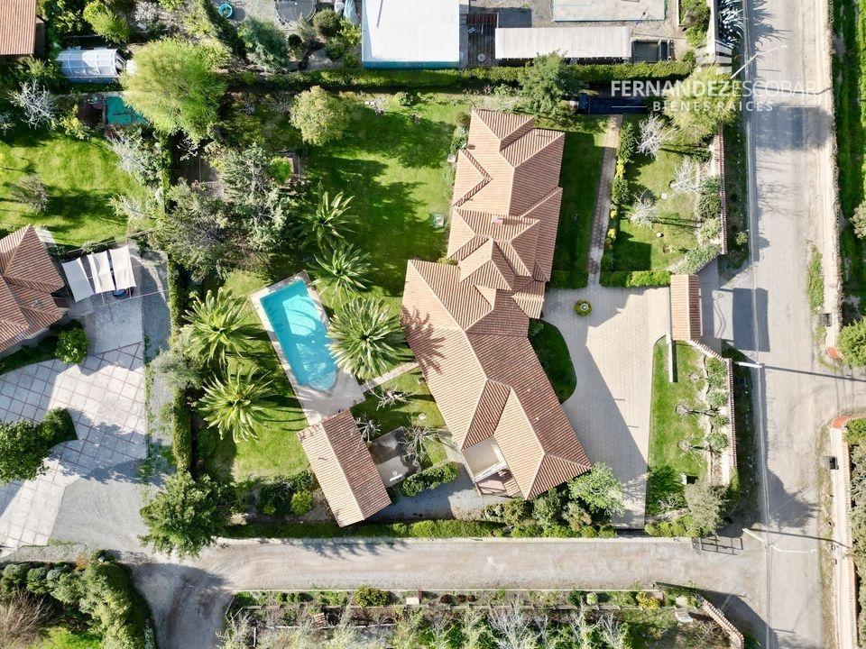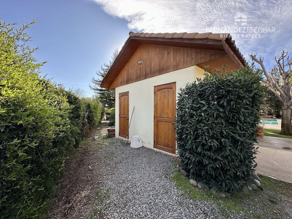 EXTERIORES: Doble portón de ingreso. Patio con quincho, psicina de 5x10, terraza cubierta, tres bodegas, canil y patio de servicio. Ante jardin con estacionamiento para seis vehículos, dos cubiertos. Múltiples árboles frutales, entres ellos podemos encontrar: durazno, peras, manzanas, caquis, higuera, limones, ciruelo, naranja, etc. Además cuenta con árboles nativos como liquidámbar y cipreses.