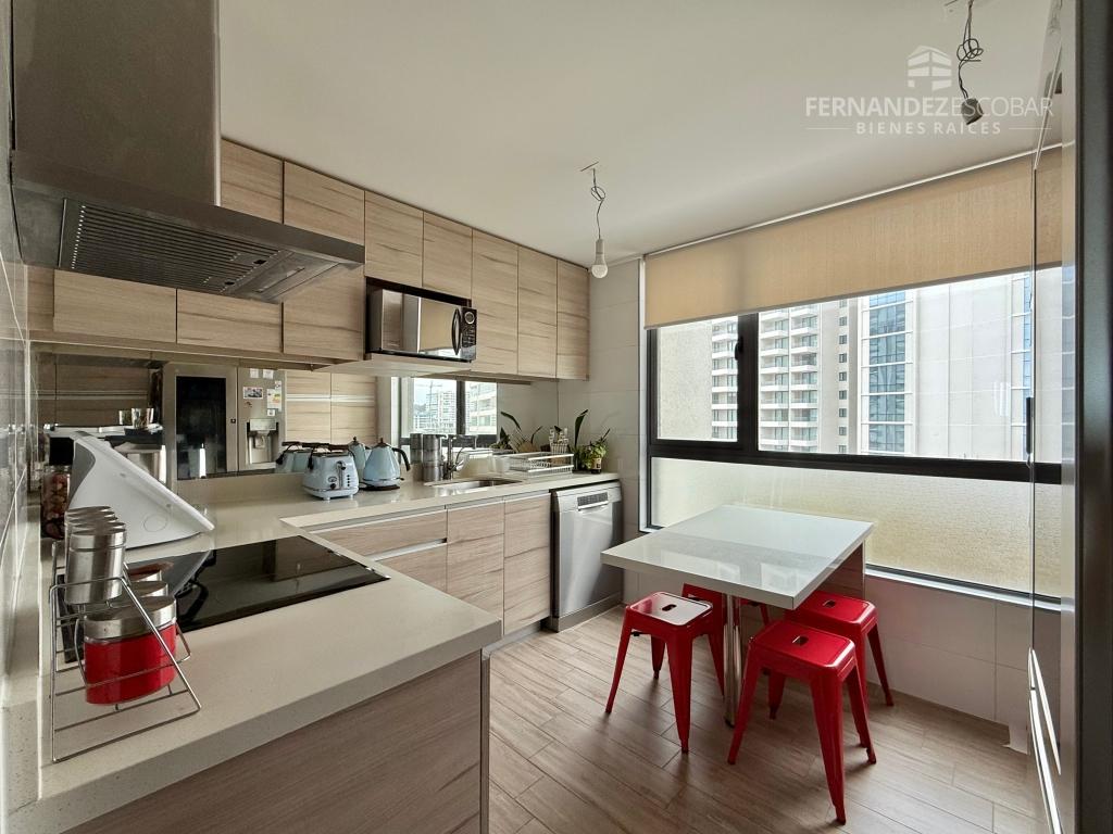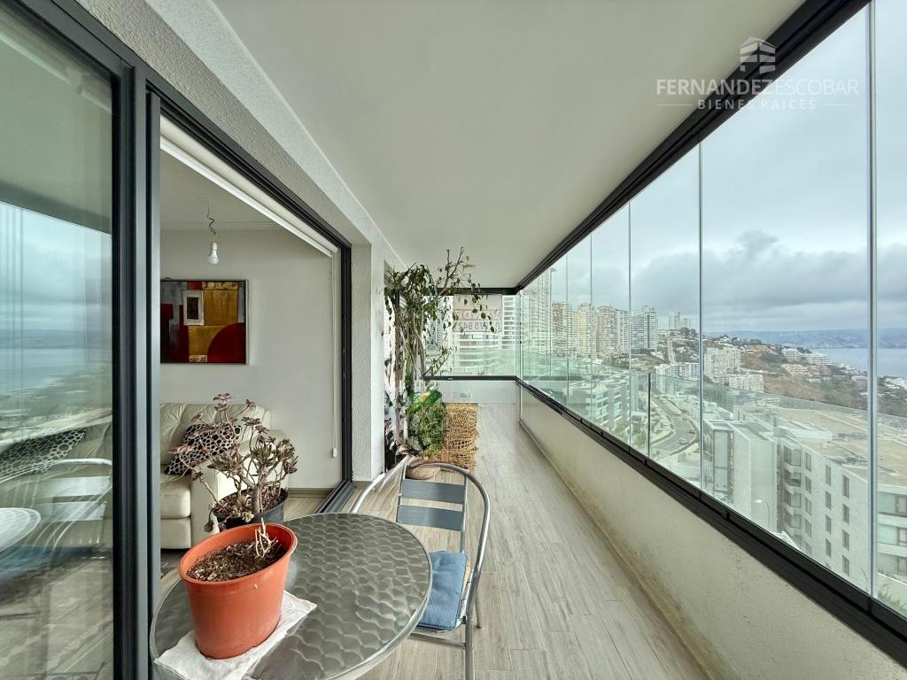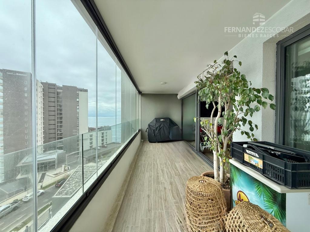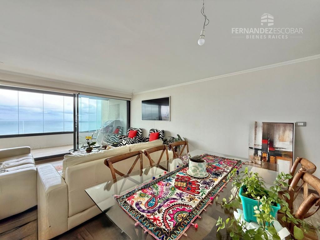 Departamento con hall de ingreso, living comedor con salida a la terraza. Cocina separada, amoblada y equipada con vitrocerámica, horno y campana (tiene conexión para lavavajillas). Lavadero cerrado. Dormitorios con closet, principal con baño en suite con shower door y salida a la terraza. Segundo baño completo con tina. Closet en pasillo. Terraza con maravillosa vista al mar y cierre vidriado. Dos estacionamientos subterráneos y bodega.