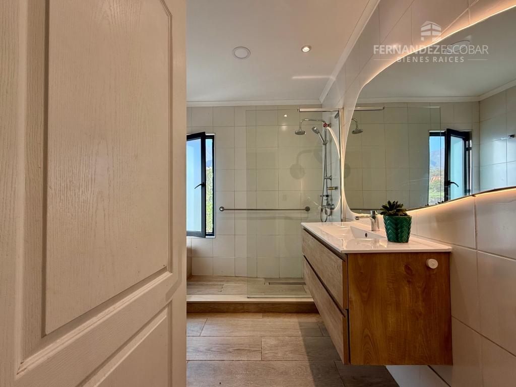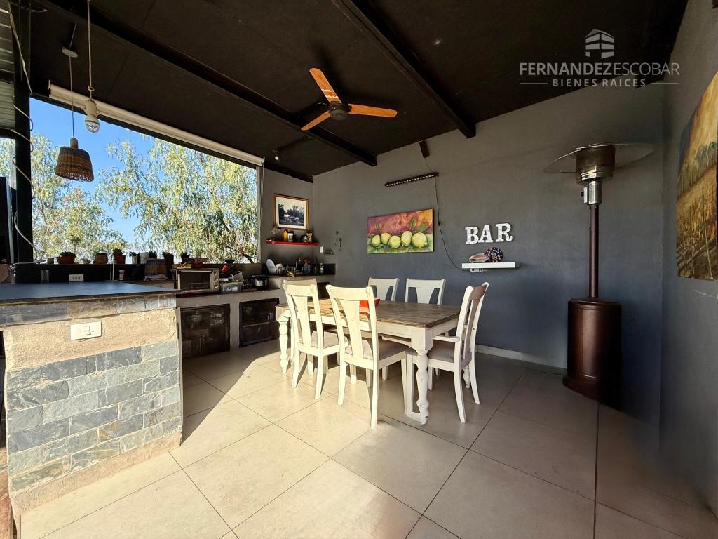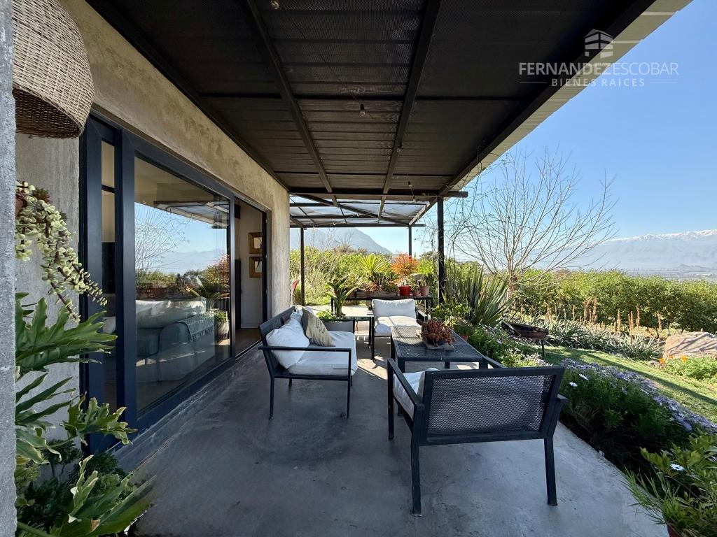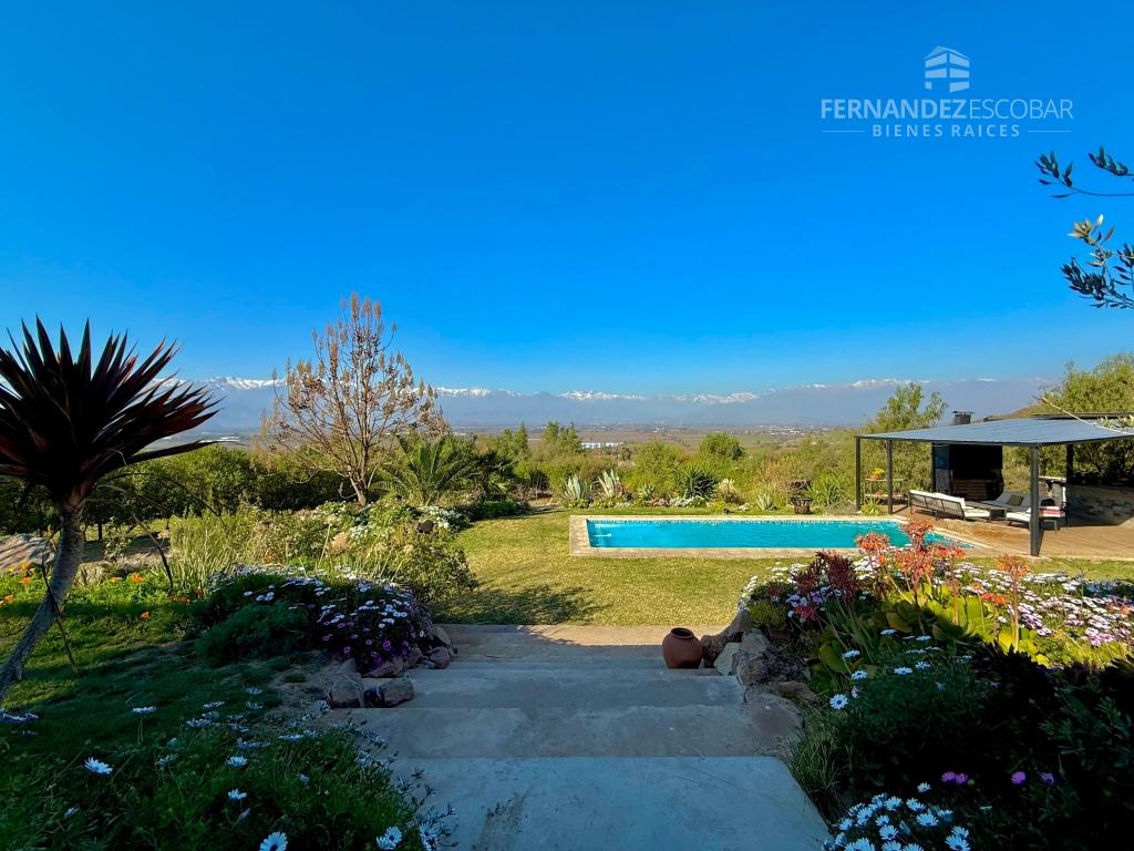 EXTERIORES: Amplio patio con jardín y árboles frutales como naranjo, limonero, paltos, durazno, pomelo, etc. terrazas de cemento pulido, piscina 10x4. Quincho independiente completo con parrilla, comedor, lavaplatos, terraza con deck de hormigón techado de 90 m². Baño completo y dormitorio. Fogón empedrado. Hermosa vista hacia el valle y la cordillera de Los Andes. Portón eléctrico y estacionamiento techado para cuatro vehículos. Planta de tratamiento y recirculación de agua (máxima el ahorro del agua para el riego). Sistema de riego por goteo.