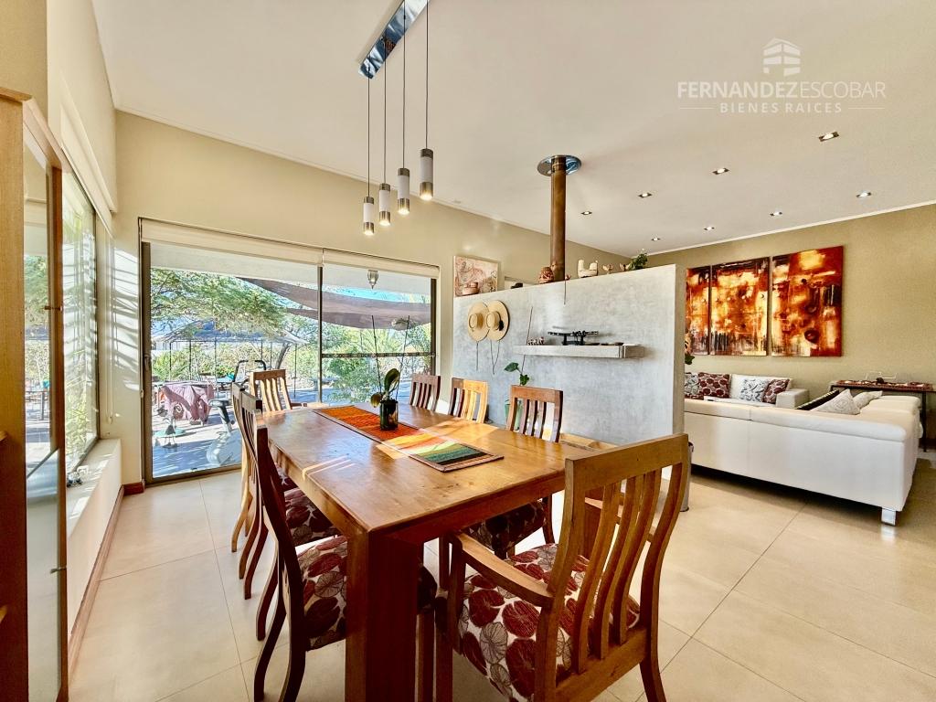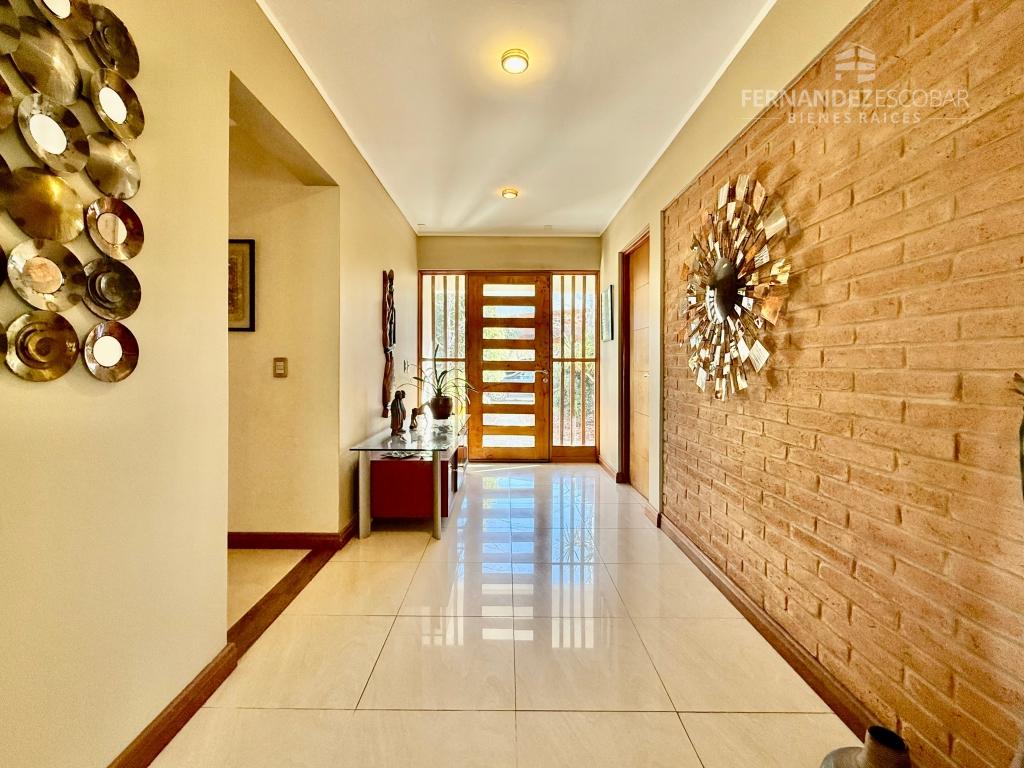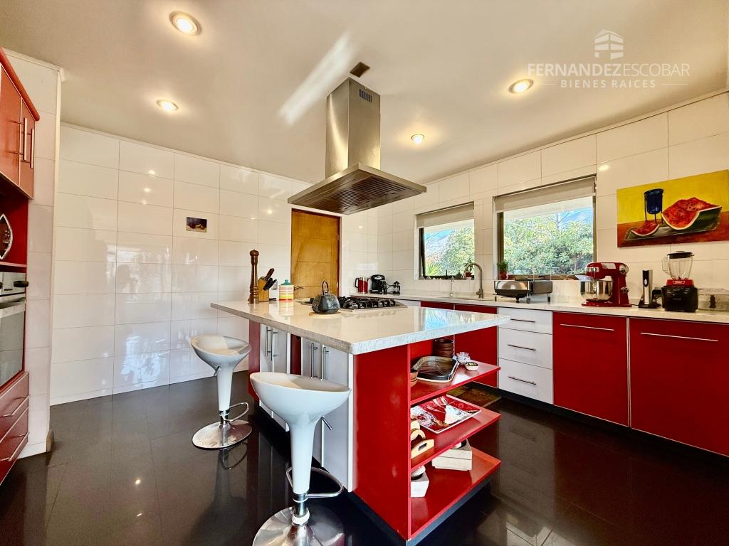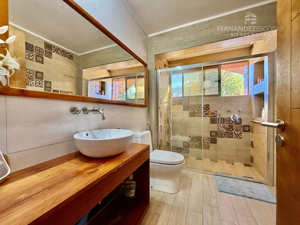 La casa principal cuenta con hall de ingreso y baño de visitas. Cocina separada con comedor de diario, amoblada y equipada con horno, encimera y campana. Living en desnivel con bosca en mueble insitu de hormigón armado y comedor con aire acondicionado y salida a la terraza. Sala multiuso y sala de estar. Cuatro dormitorios con closet, principal con walking clóset, bosca, aire acondicionado y baño en suite con doble lavamanos. Tercer baño con shower Door. Maravillosas vistas hacia la cordillera de Los Andes y al Valle.