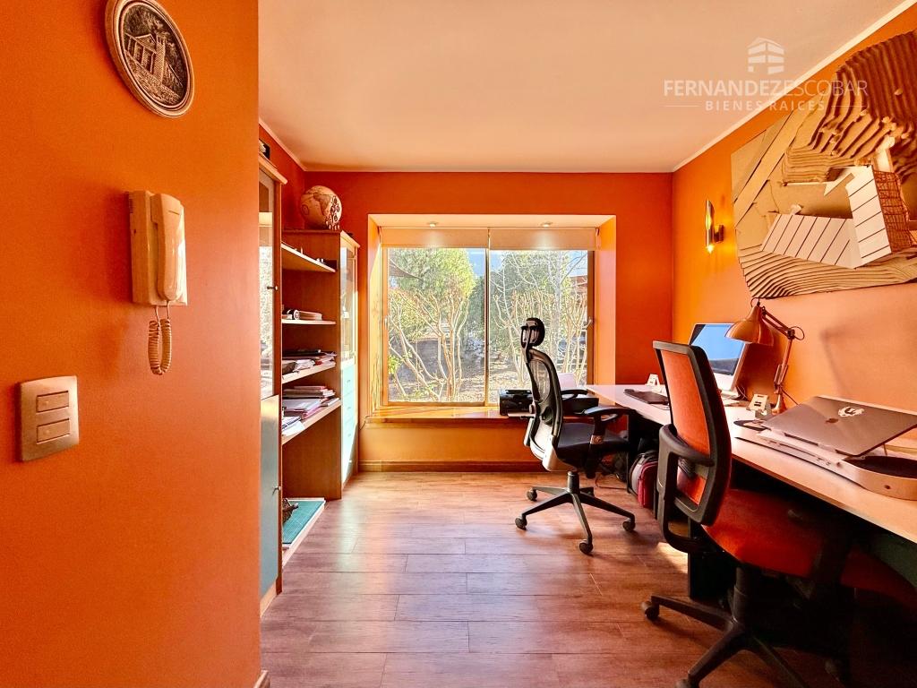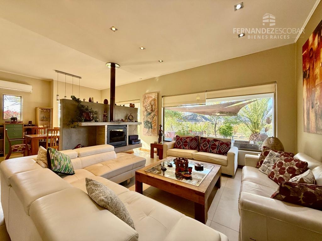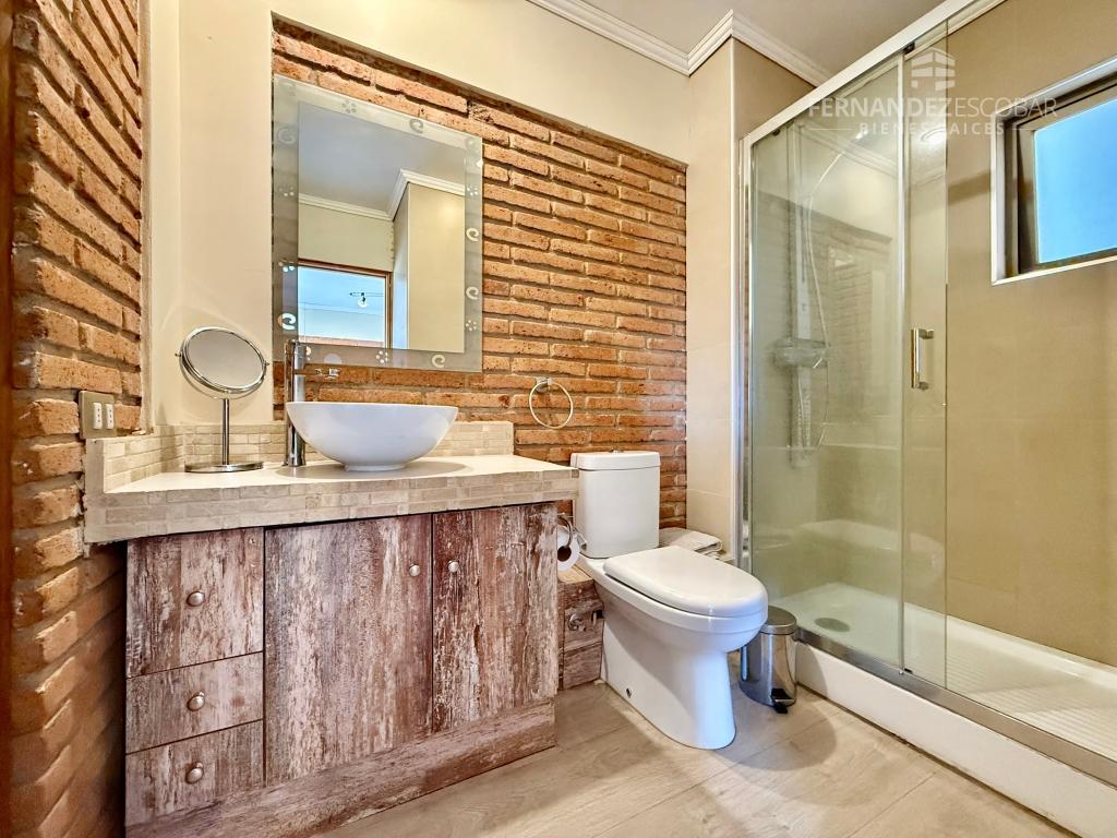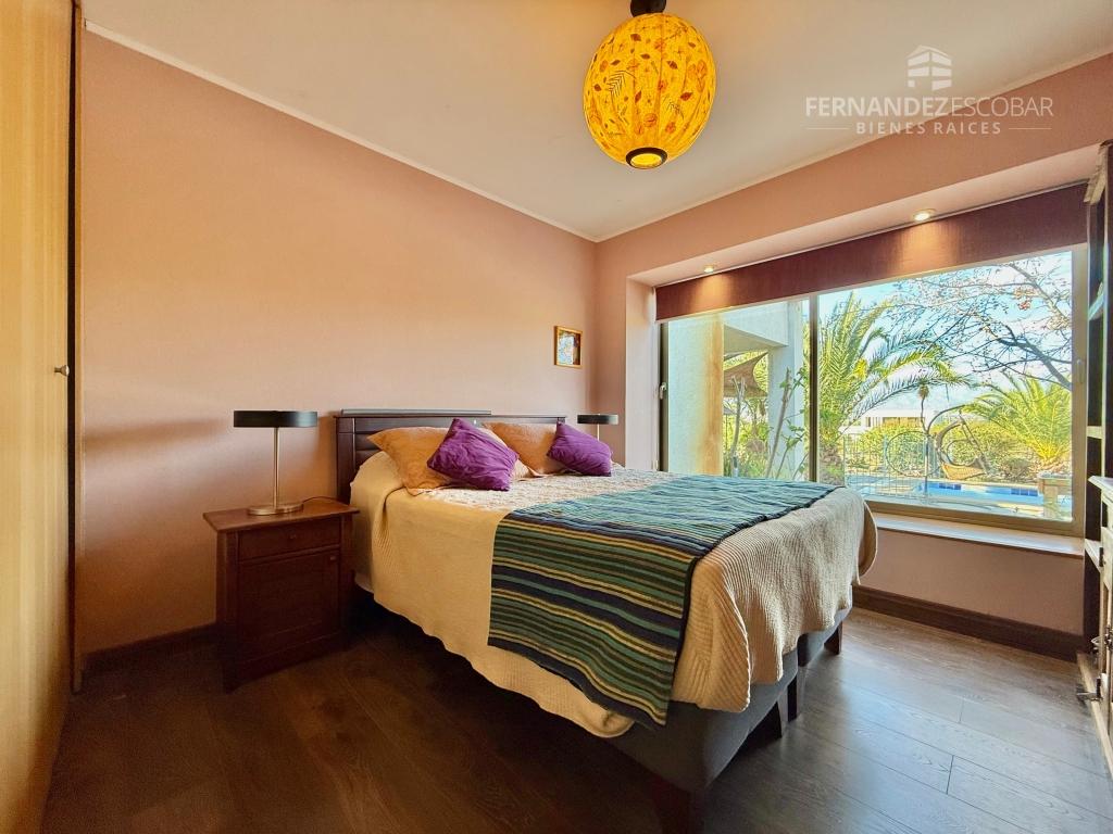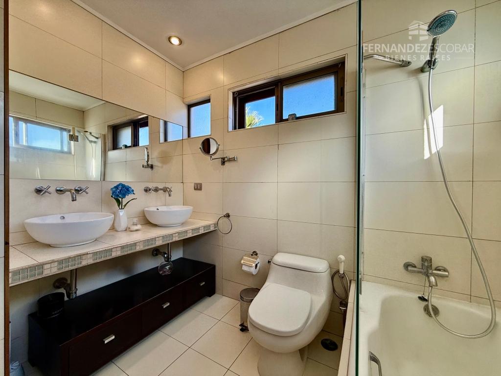 La casa principal cuenta con hall de ingreso y baño de visitas. Cocina separada con comedor de diario, amoblada y equipada con horno, encimera y campana. Living en desnivel con bosca en mueble insitu de hormigón armado y comedor con aire acondicionado y salida a la terraza. Sala multiuso y sala de estar. Cuatro dormitorios con closet, principal con walking clóset, bosca, aire acondicionado y baño en suite con doble lavamanos. Tercer baño con shower Door. Maravillosas vistas hacia la cordillera de Los Andes y al Valle.